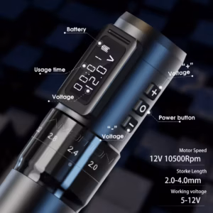 Professional wireless rotary tattoo pen with 2400 mAh power pack and LED digital display. Combines precision, mobility, and long-lasting performance for body art.