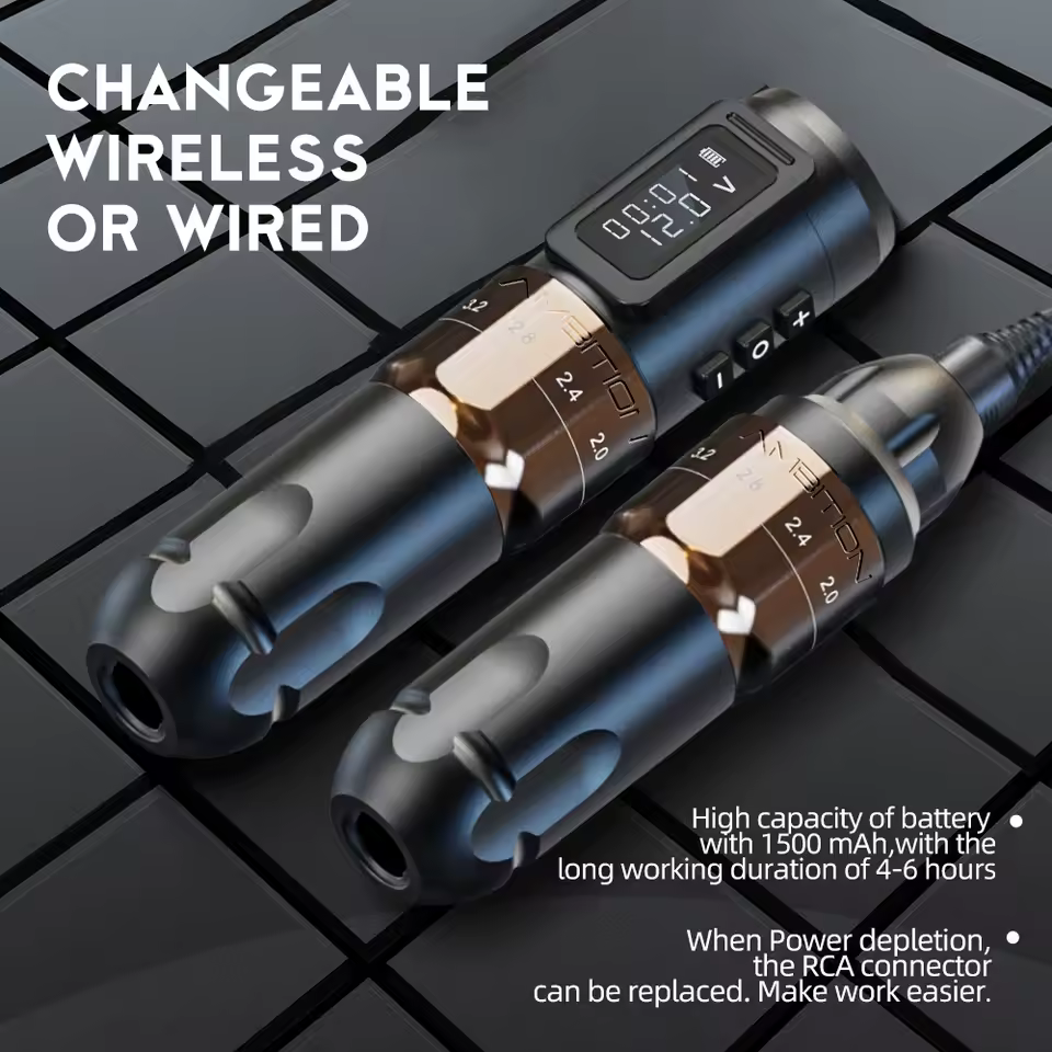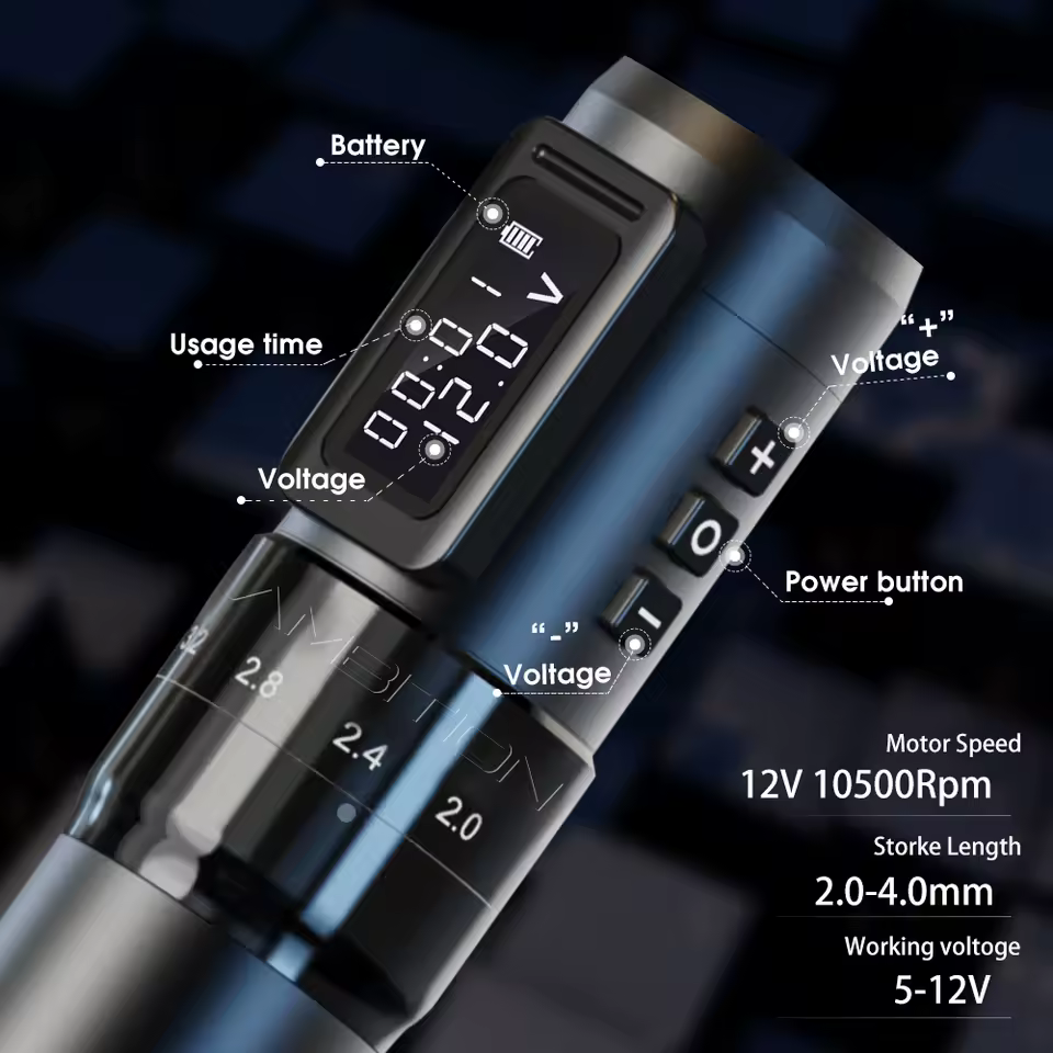 Kõrgetasemeline juhtmevaba tätoveerimispulk reguleeritava käiguga (2–4 mm) ja võimsa 1800 mAh harjadeta mootoriga. Loodud professionaalsetele tätoveerijatele, kes hindavad mitmekülgsust, täpsust ja liikuvust.