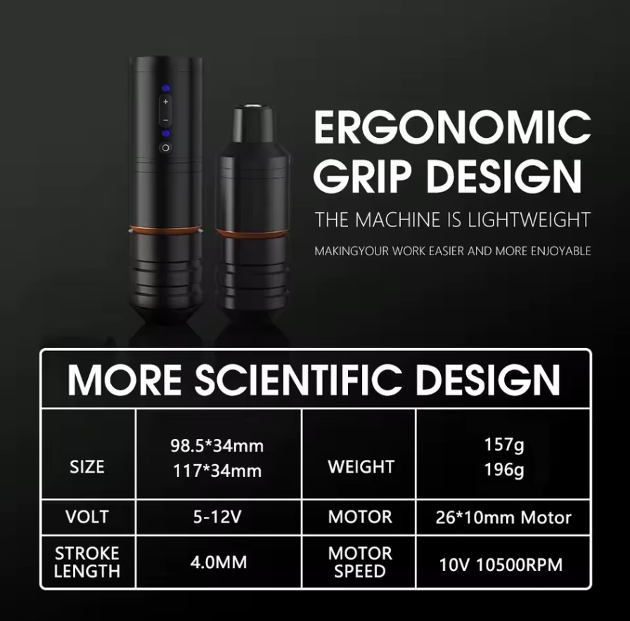 Professionaalne juhtmevaba pöörlev tätoveerimispulk võimsa 2400 mAh akuga ja tugeva harjadeta mootoriga. Pakub liikuvust, täpsust ja vastupidavust kaasaegsetele tätoveerijatele.